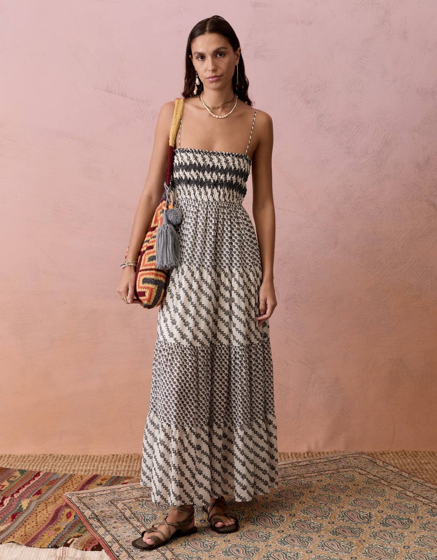 BOTEH’s Levante Shirred Maxi Dress in Pebble Black is crafted in 100% organic cotton voile with charcoal motifs on a Pebble base. The fitted bodice is shaped with elastic shirring and adjustable straps for a comfortable, flexible fit, falling into a tiered maxi skirt for soft movement. Signature BOTEH “Hera” appliqué on the bodice is finished with hand blanket-stitch detailing.