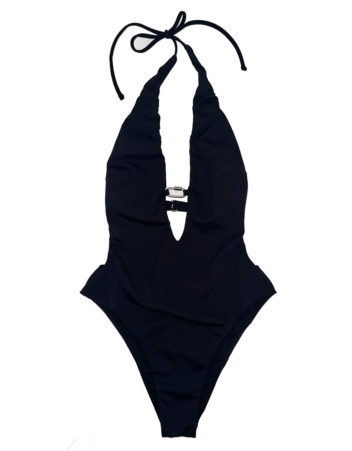 The Ziah Halter Hardware One Piece makes a precise statement in black. A plunging halter neckline is anchored by a central sterling silver hardware detail, while an open back and high-cut leg line elongate the silhouette. Designed to offer support for all bust sizes.