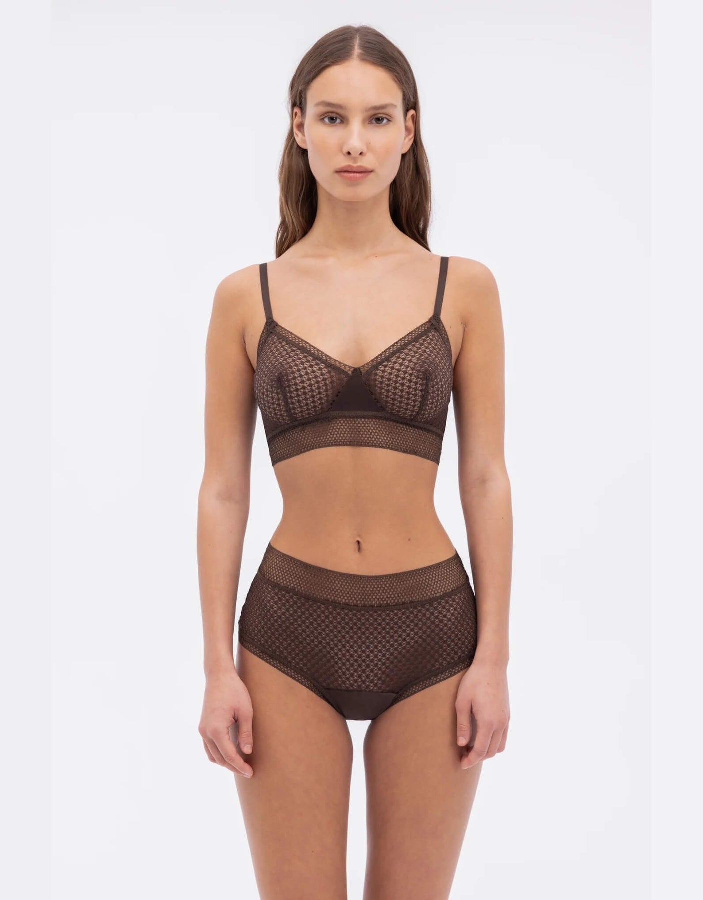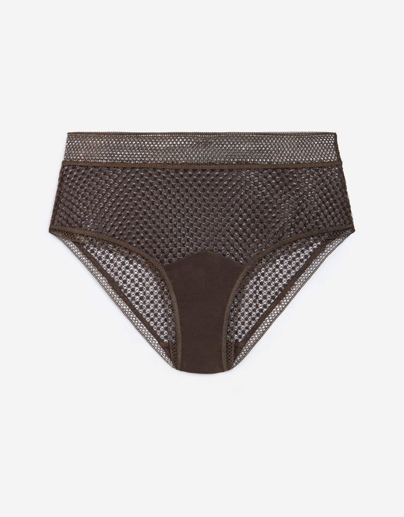 The Bella high waist brief in rich Turkish Coffee has a high waist silhouette with a wide, sheer waistband for elegant coverage and comfort.