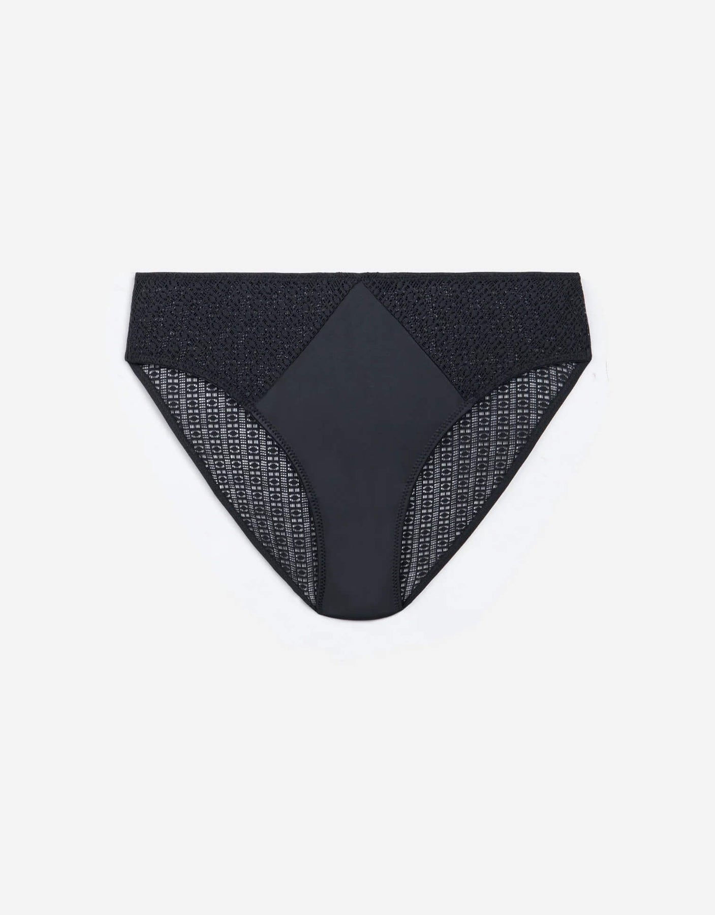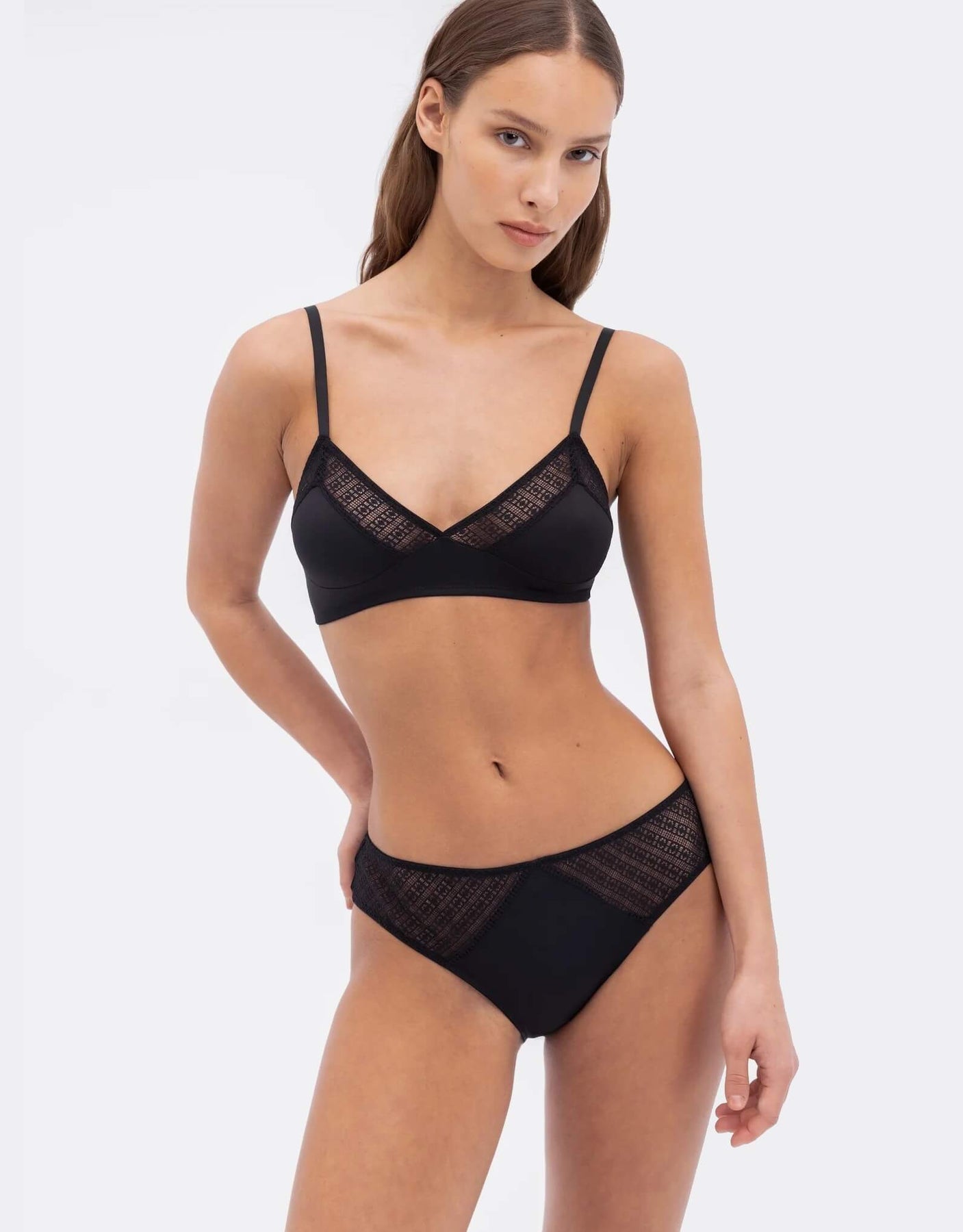 The Matrix Brief in black by Else is a seductive blend of graphic modernity and silky comfort. Crafted from exceptionally soft microfibre for a smooth, flattering fit, it features sustainable geometric lace that plays with linear patterns and sheer detailing. A perfect balance of everyday wearability and contemporary design.