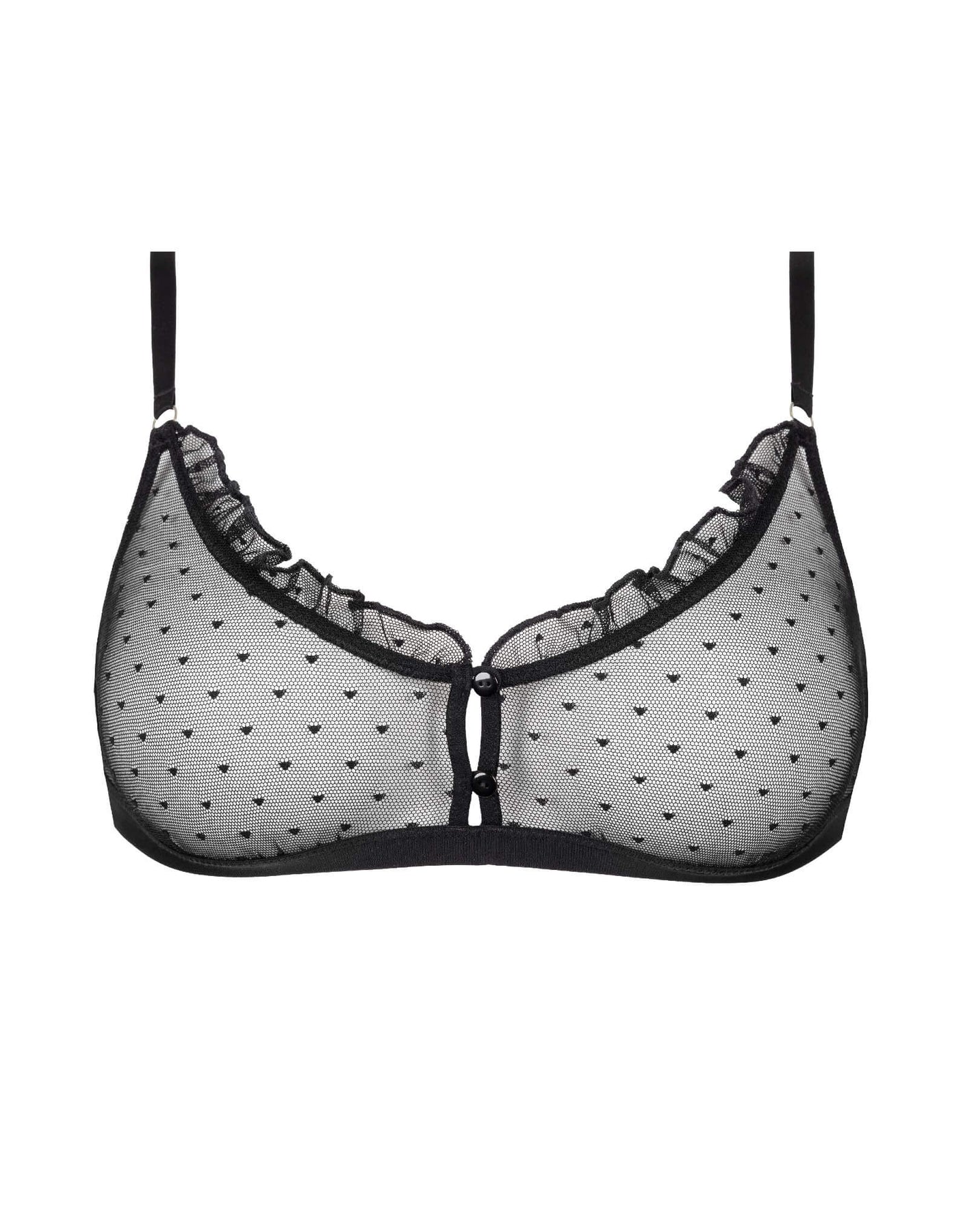 The Coup de Foudre Bralette by Atelier Amour is crafted in sheer black plumetis tulle, a delicate dotted fabric that feels light against the skin. Its softly rounded neckline flatters the bust, while small ruffles add a feminine, vintage-inspired touch. Two tiny buttons accent the front for a subtle yet seductive detail.