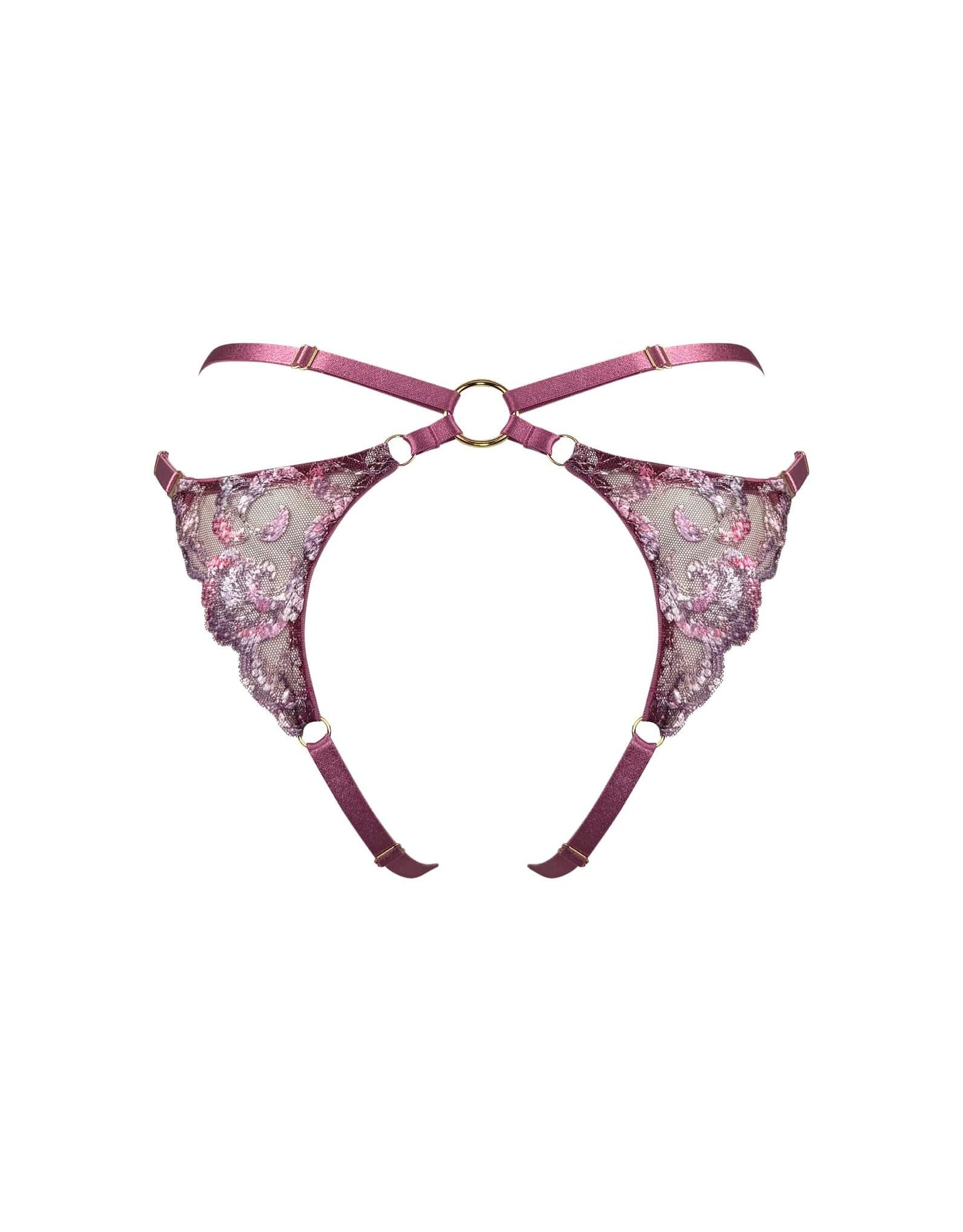 A bold statement in any lingerie look, Bordelle's open back brief is crafted from bespoke embroidered tulle and satin elastic harness strapping. Lace panels frame the back, while 24k gold plated shell components add a touch of opulence to the front of this daring style.