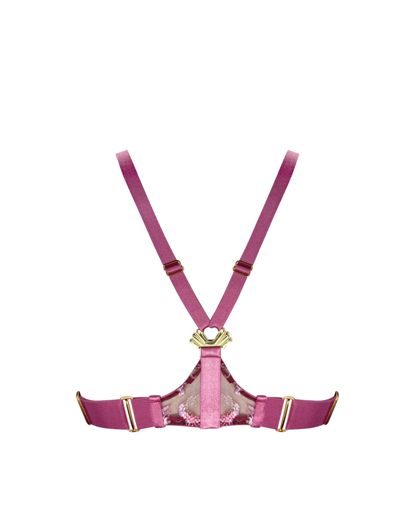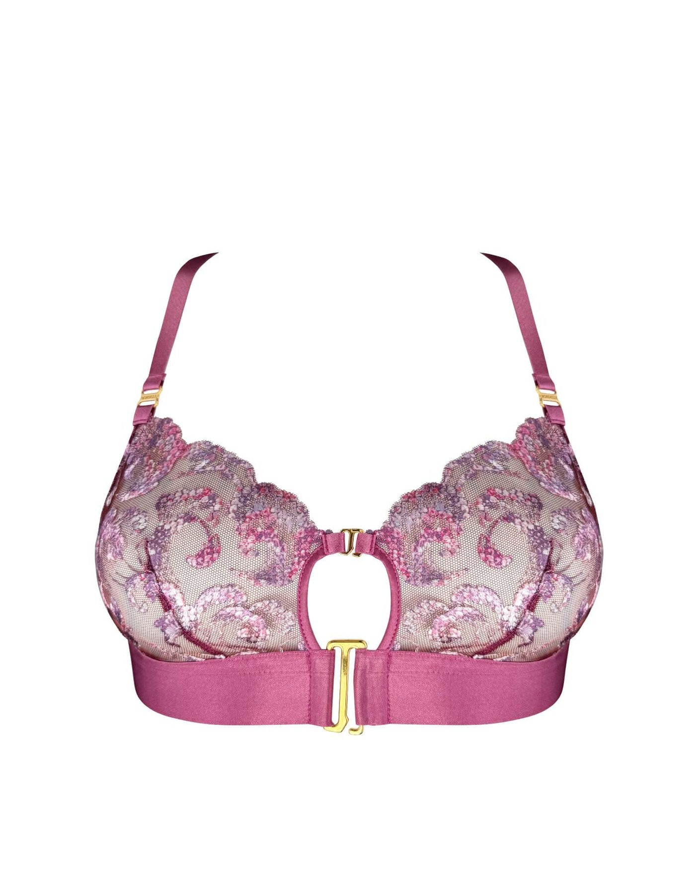Bordelle's Siren lace soft cup bra combines comfort with refined detail. Crafted with a soft wide band elastic underband for gentle support, this non-wired style prioritises wearability without compromising on design. A delicate panel of embroidered tulle is complete with a 24k gold plated shell component to elevate the back, while two swan hook fastenings at the front create a striking focal point