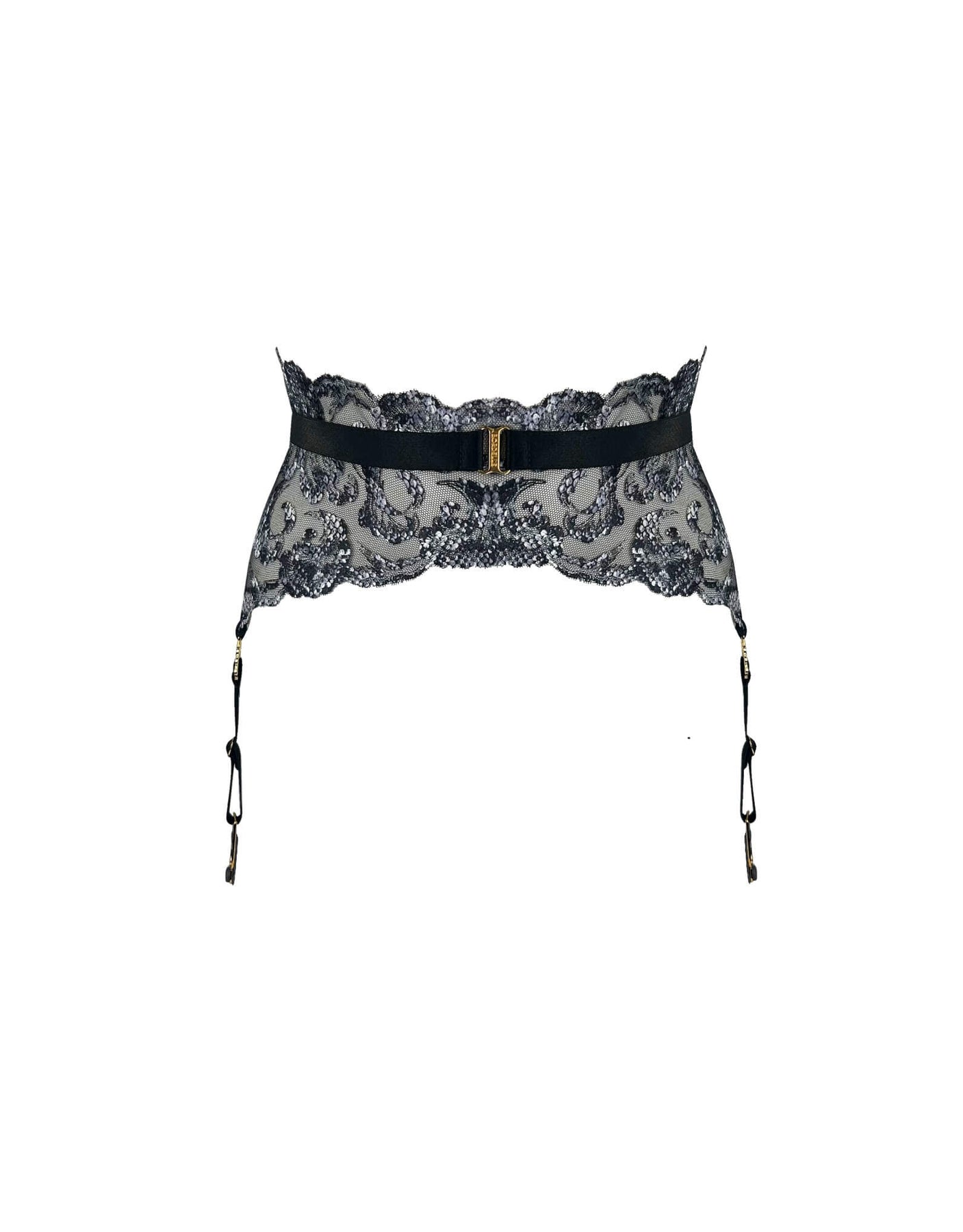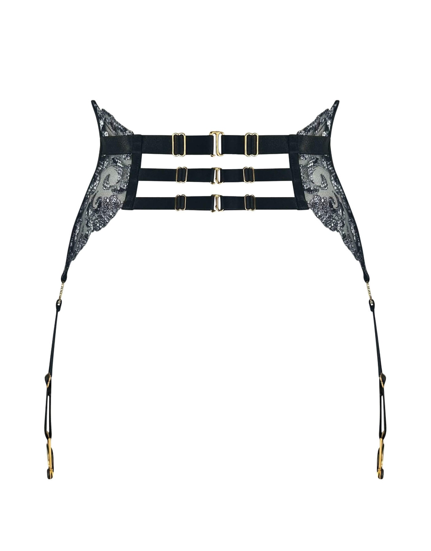 Bordelle Siren Suspender in black embroidered lace with 24k gold-plated shells and satin elastic straps – luxury lingerie at Catriona