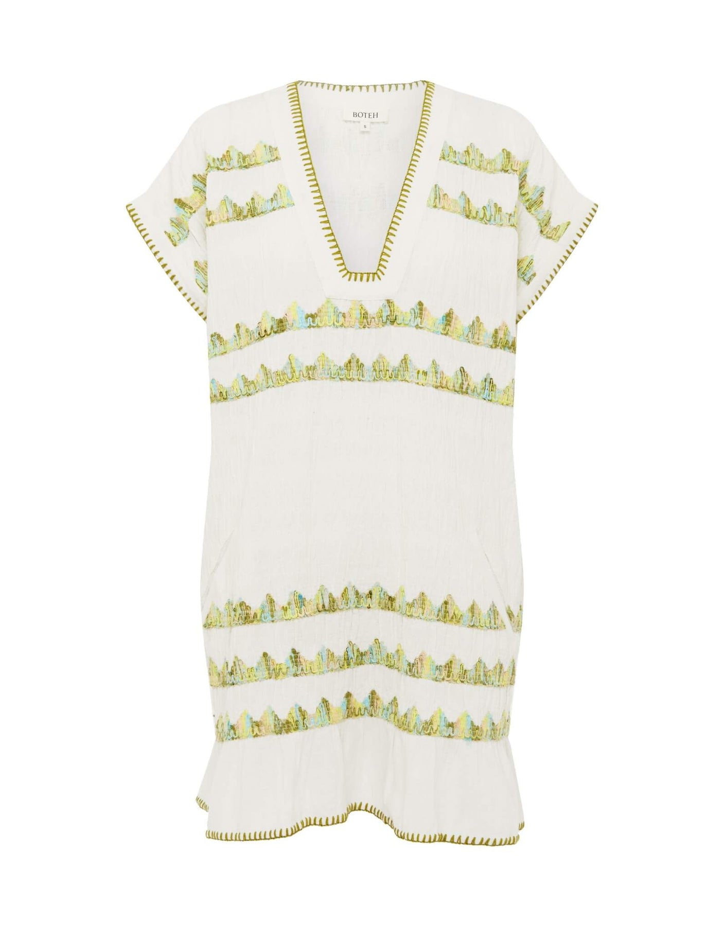 BOTEH’s best selling Hera Tunic Mini Dress is an effortless mini-length and the ultimate beach cover-up. Exclusive appliqué smocking adds texture and detail, while hand blanket stitching frames the edges for a beautifully crafted finish. The Coconut color way is in shades of fresh green on soft white. Complete with functional front pockets for easy, everyday wear.