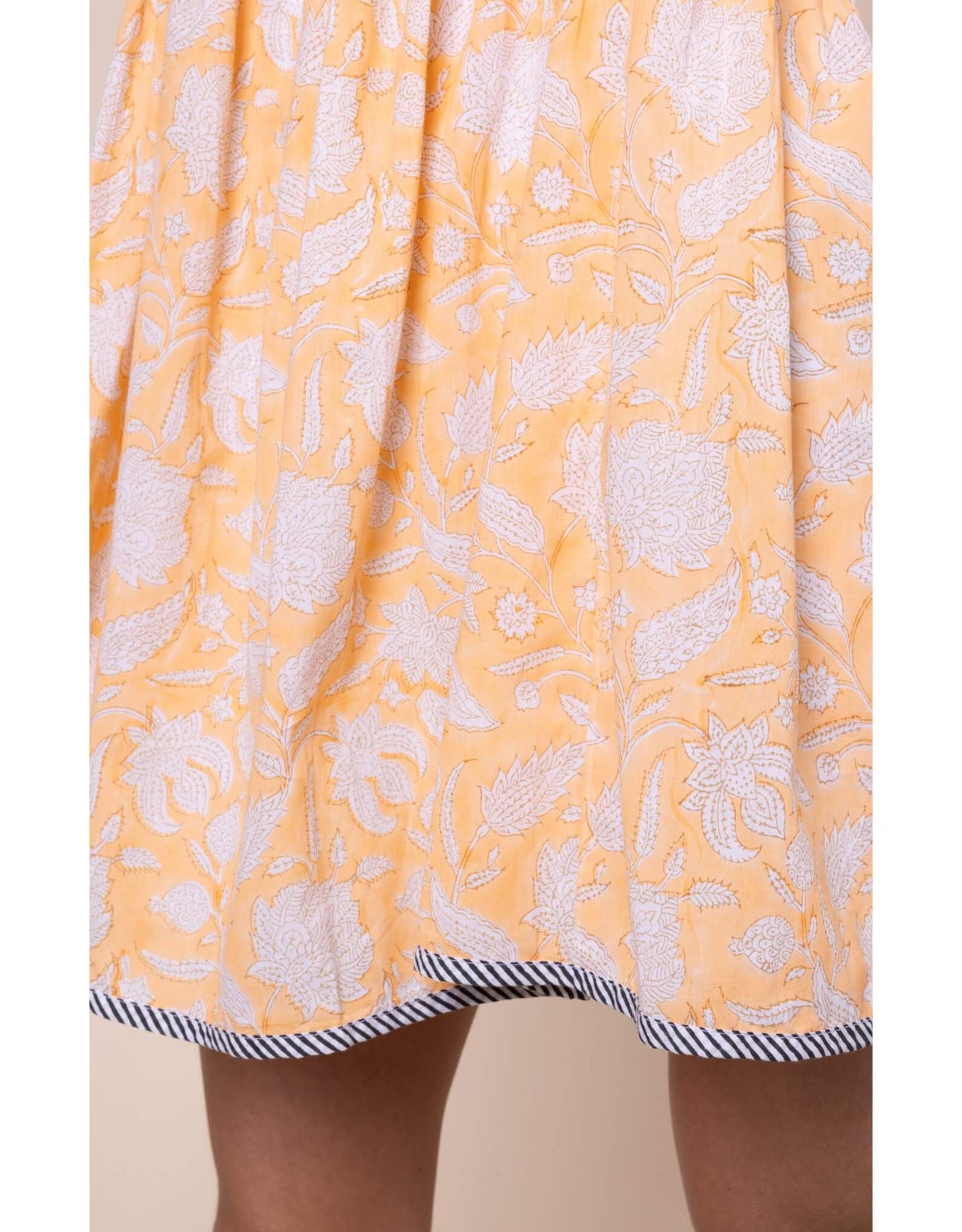 Juliet Dunn’s romantic block print dress features a Pomegranate print in a soft Papaya tone, highlighted with a contrasting stripe trim. The silhouette is relaxed and easy, with a loose, gently gathered skirt that creates a light, flirty feel while allowing comfort and movement.