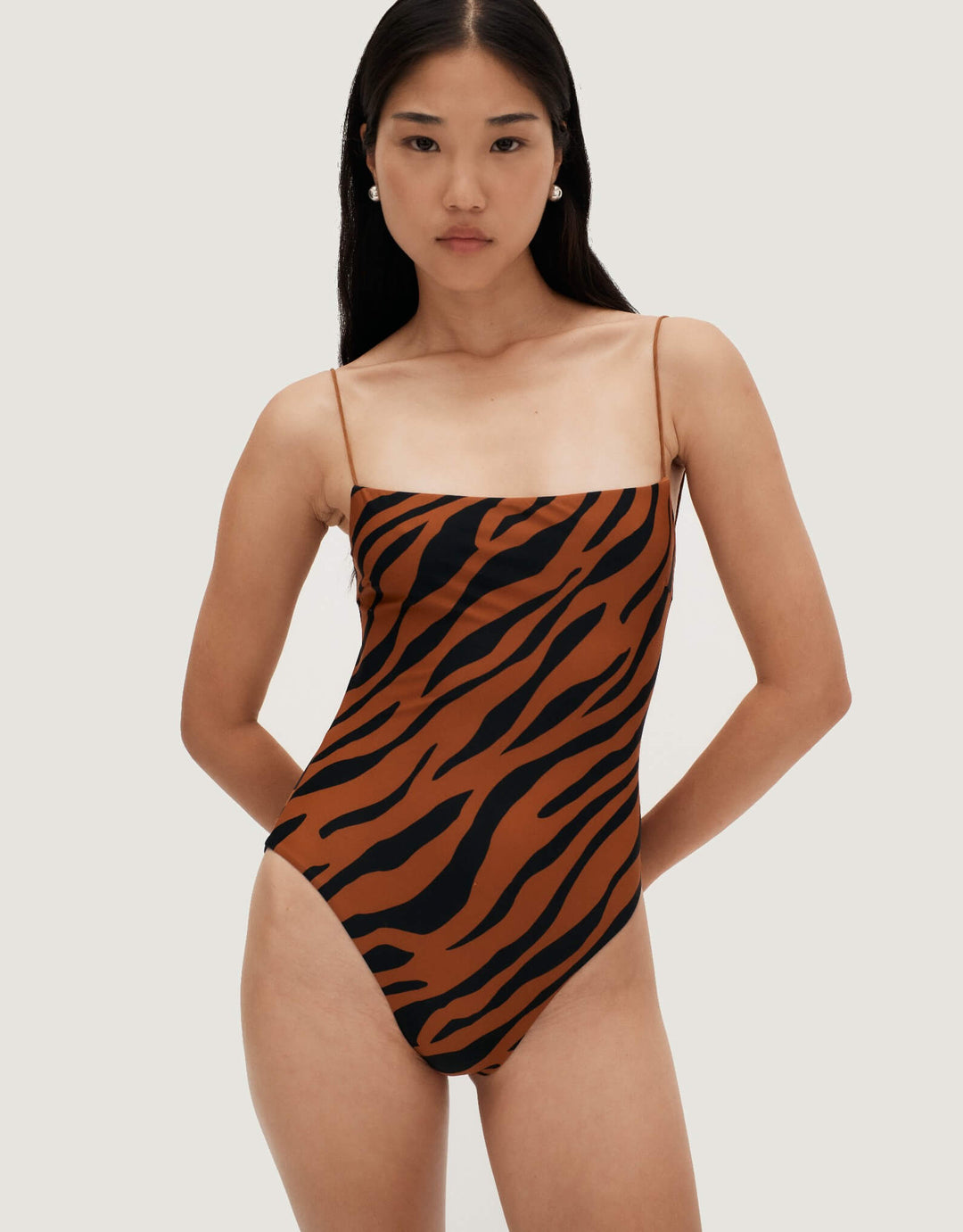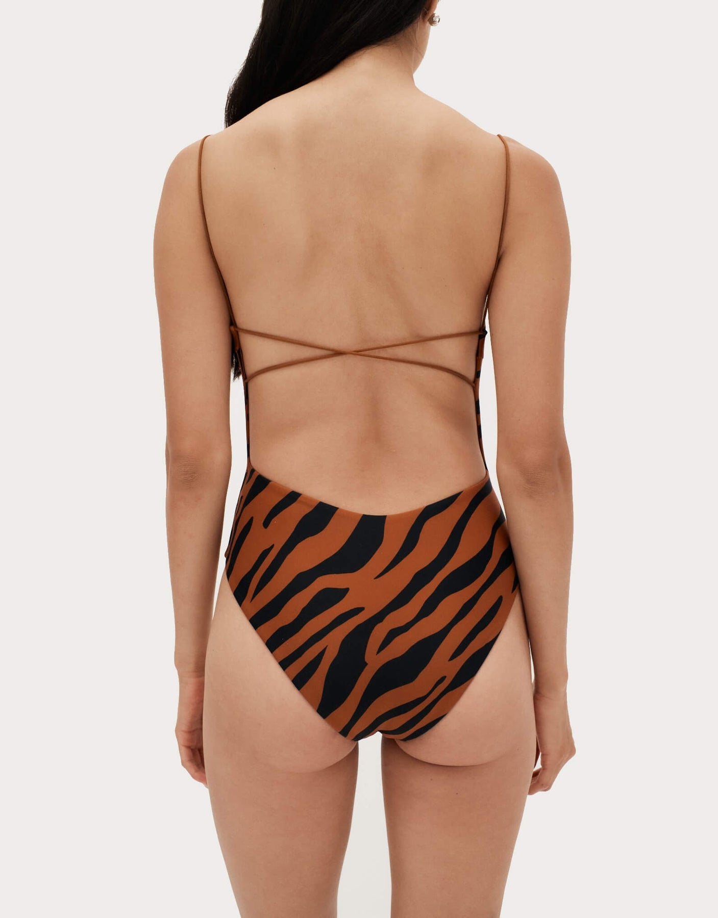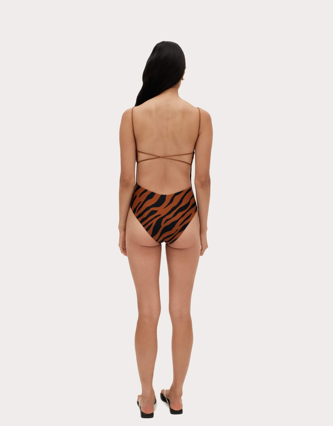 The signature Ziah silhouette Fine Strap One Piece is now available in best selling Brown Zebra. Beautifully designed with an exposed back, elegant elasticated thin straps and figure-flattering high cut legs.
