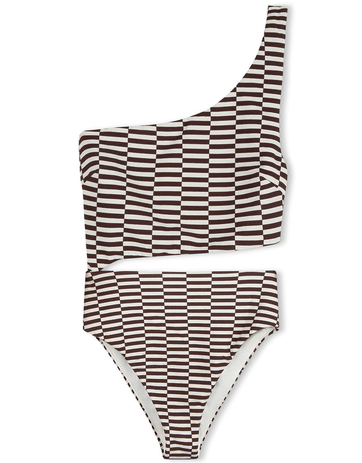 The Cocoa Grid Textured One Piece by Zulu & Zephyr offers a chic, modern grid fabric with a soft, buttery feel. Designed with a flattering one shoulder silhouette and a cut-out waist, it provides a sculpted, moderate coverage fit. A timeless wardrobe essential, this versatile one piece doubles as a sleek bodysuit for effortless styling.