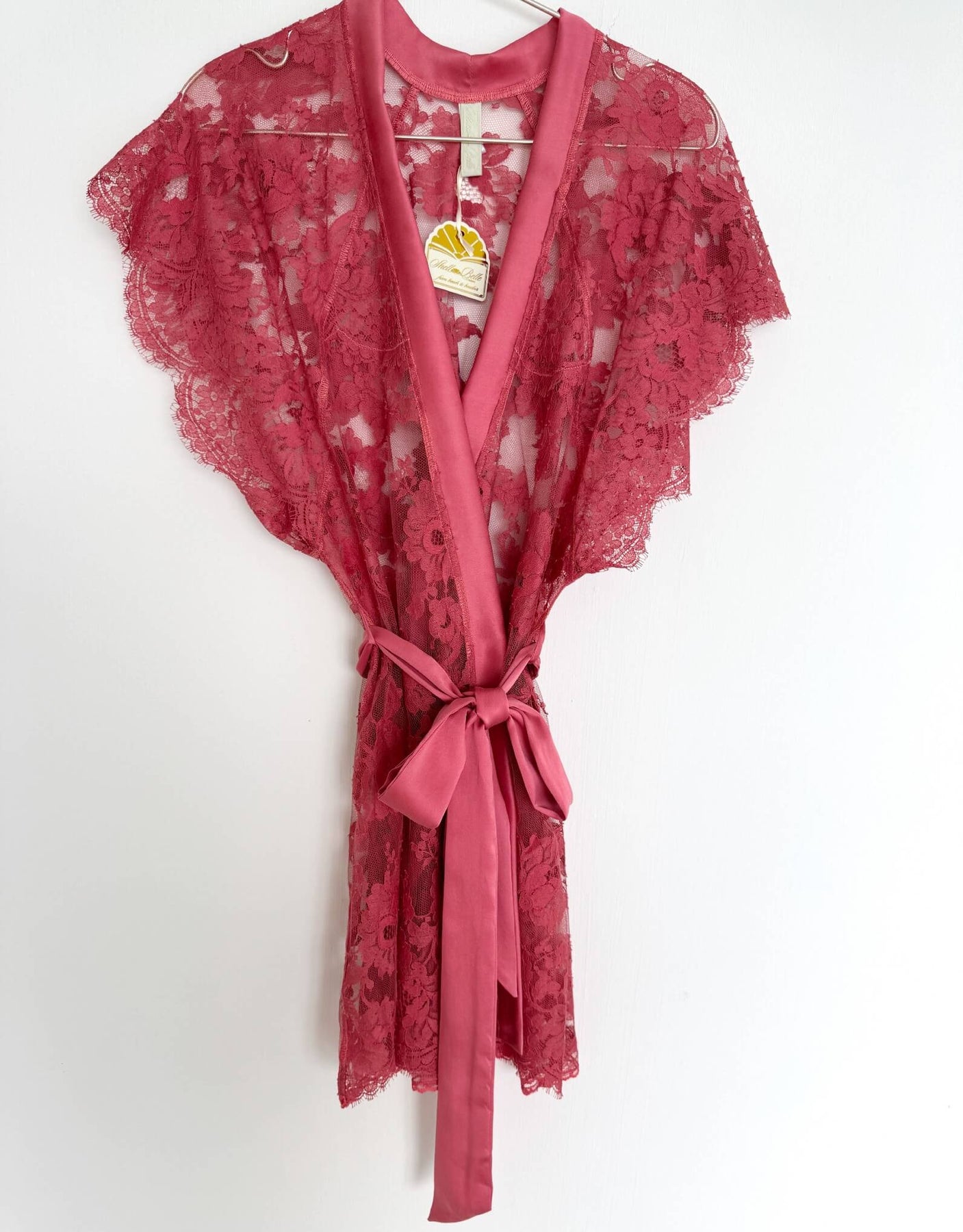 A gorgeous French Leavers lace kimono, the Grace Kimono by Shell Belle Couture is crafted in a dramatic large-scale floral lace in the most divine shade of Orange Blossom. It drapes beautifully in a generous butterfly silhouette. Delicate appliquéd lace scallops frame the centre front and hem, while the short sleeves are edged with scalloped lace for luxurious femininity. The neckline, front band, and sash belt are cut from soft, sandwashed Orange Blossom silk.